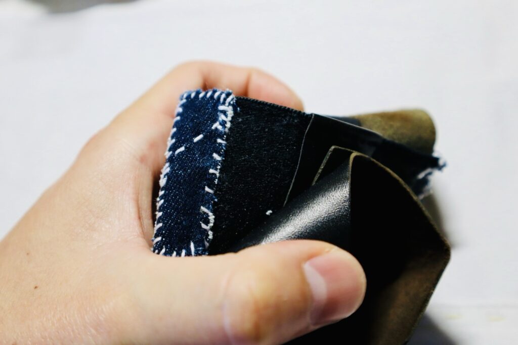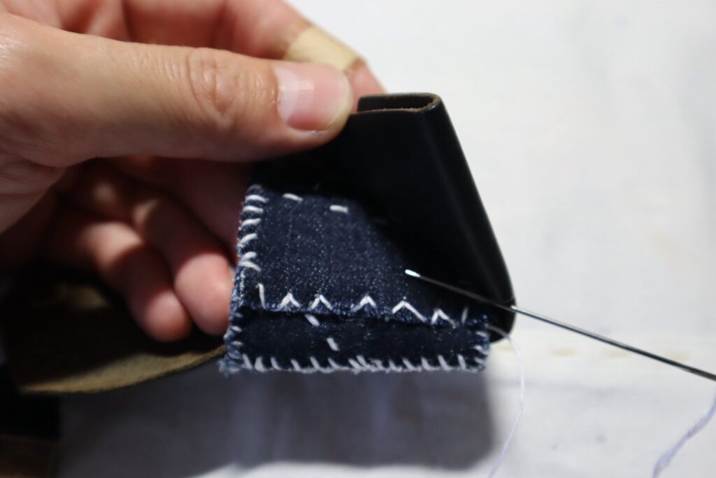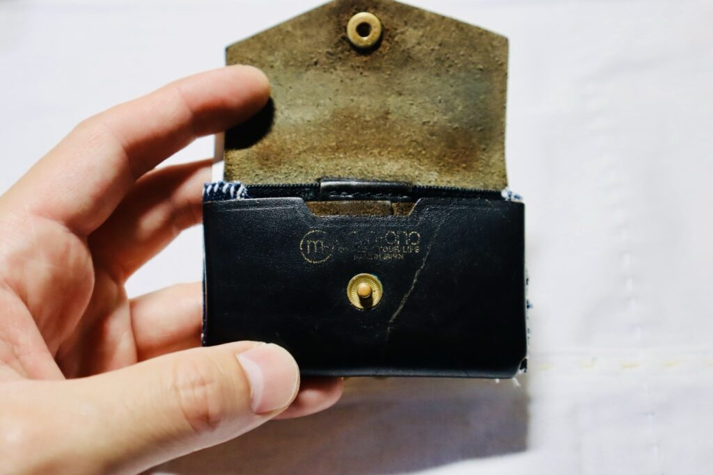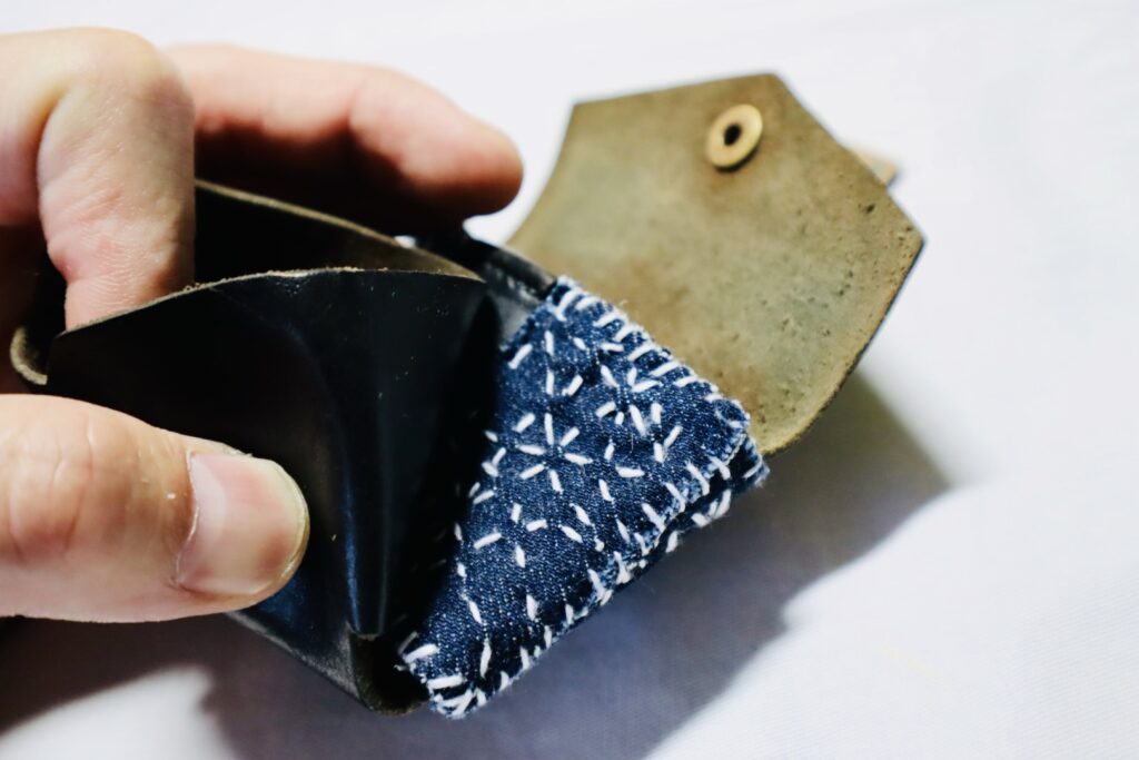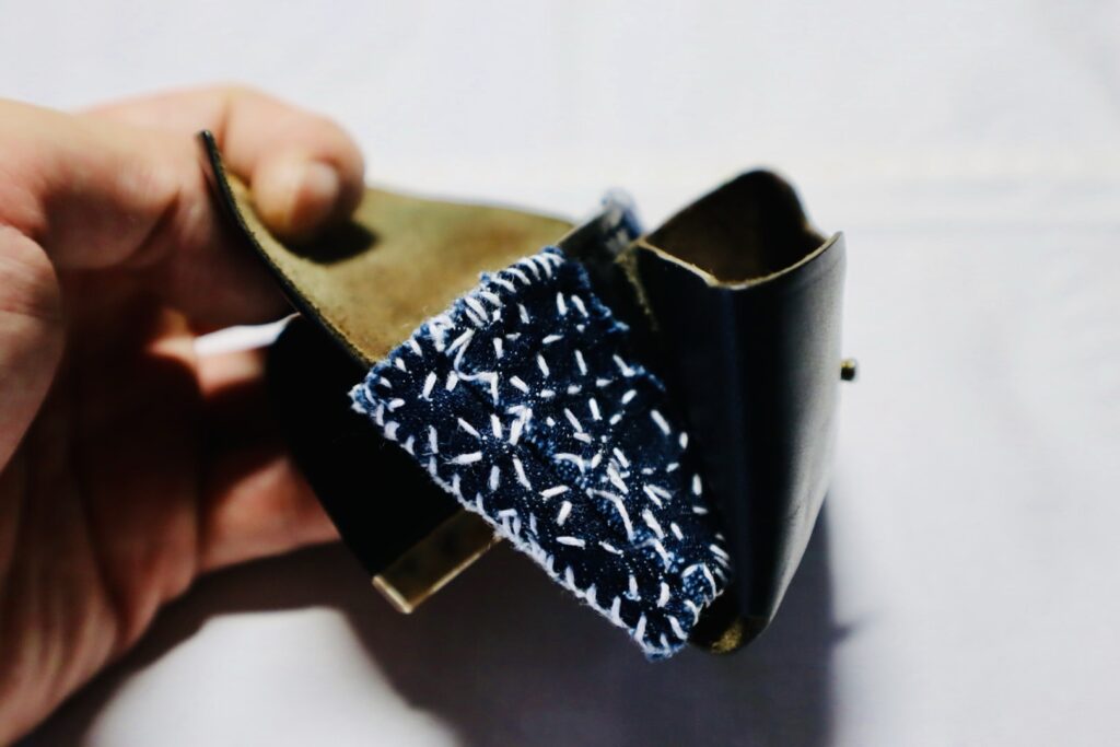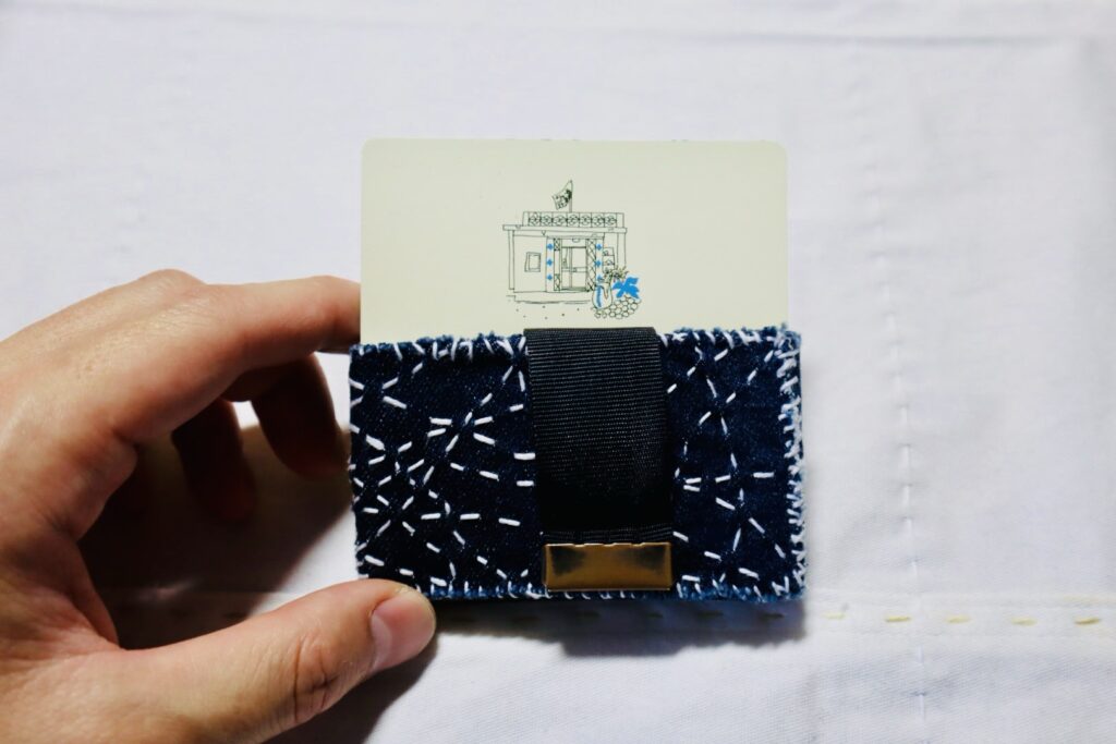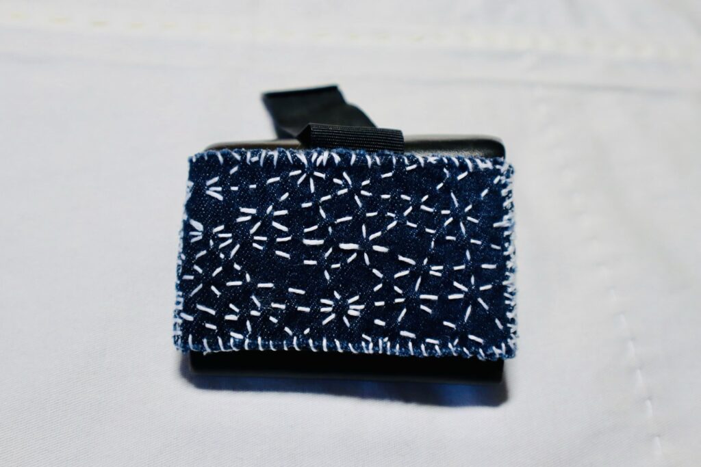 裏側はゴムベルト仕様になっており、カードを数枚収納可能。そのゴムベルトがかなり汚くなっていたので、前に「「放浪刺し子」とは」という記事を書いたときにサンプルで作った、放浪刺し子×デニムを縫い付けました。