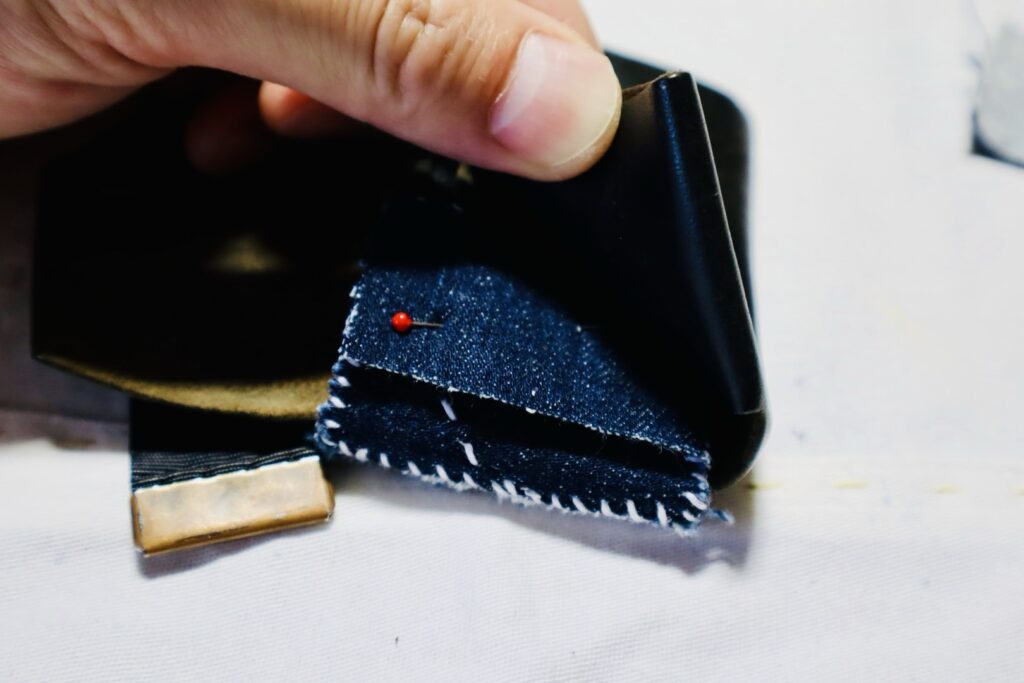 まず、足りない分のデニムを待ち針で固定します。