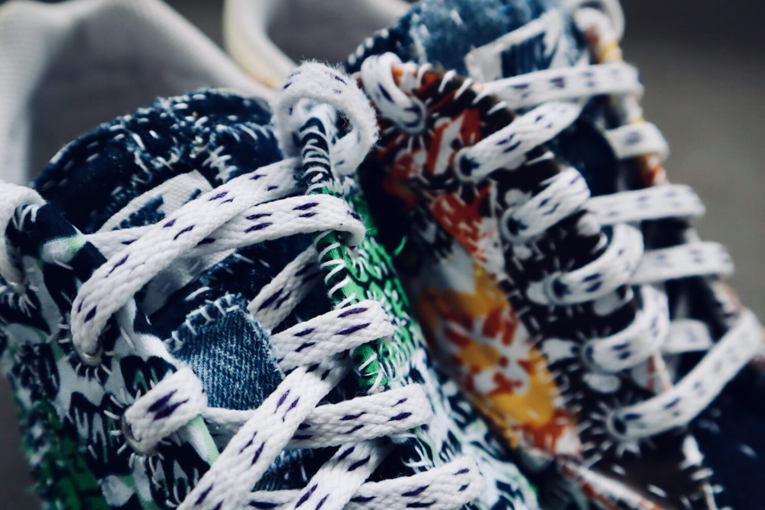 このスニーカーを修復するにあたり、まずは左外側の破れ部分をアイロンで補強布で内側を塞ぎ、そのあとはアフリカ布とデニムを使ってひたすらチクチク。